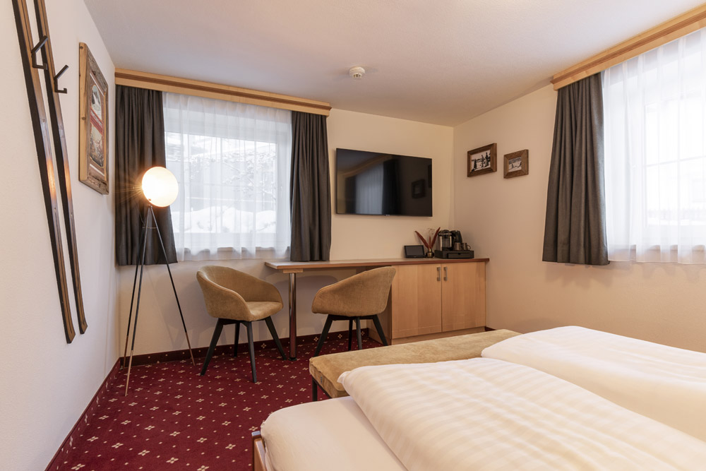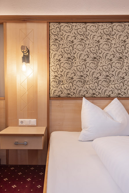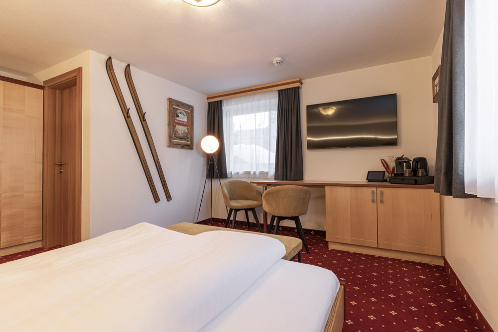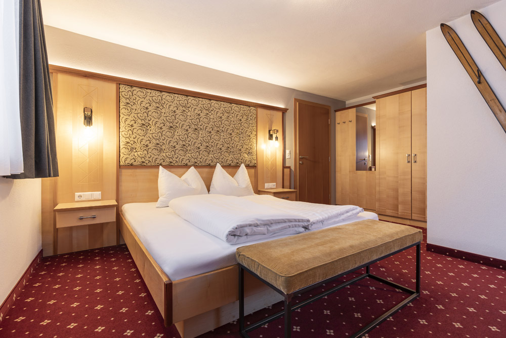 Ein gemütliches Hotelzimmer, perfekt für Urlaub zu Zweit in Serfaus-Fiss-Ladis, mit einem Doppelbett mit weißer Bettwäsche und Kissen. Es verfügt über ein hölzernes Kopfteil mit kunstvollem Design, eine Bank am Fußende, einen hölzernen Kleiderschrank und Nachttische. Der rote Teppich hat ein dezentes Muster für zusätzliche Eleganz.