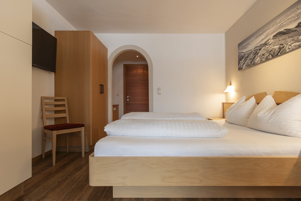 Ein gemütliches Schlafzimmer in einem Apartment für 2-3 Personen in Serfaus-Fiss-Ladis verfügt über ein Doppelbett aus Holz, weiße Bettwäsche und ordentlich angeordnete Kissen. Über dem Bett hängt ein schwarz-weißes Bergfoto, das von einer Wandlampe neben einer gewölbten Tür in warmes Licht getaucht wird.