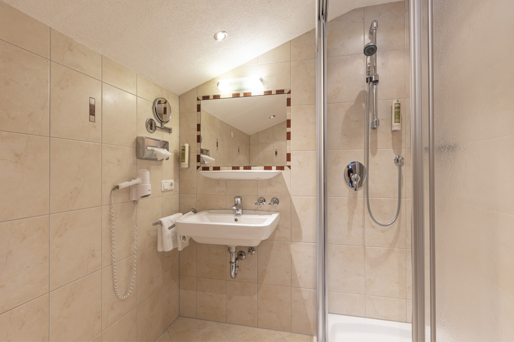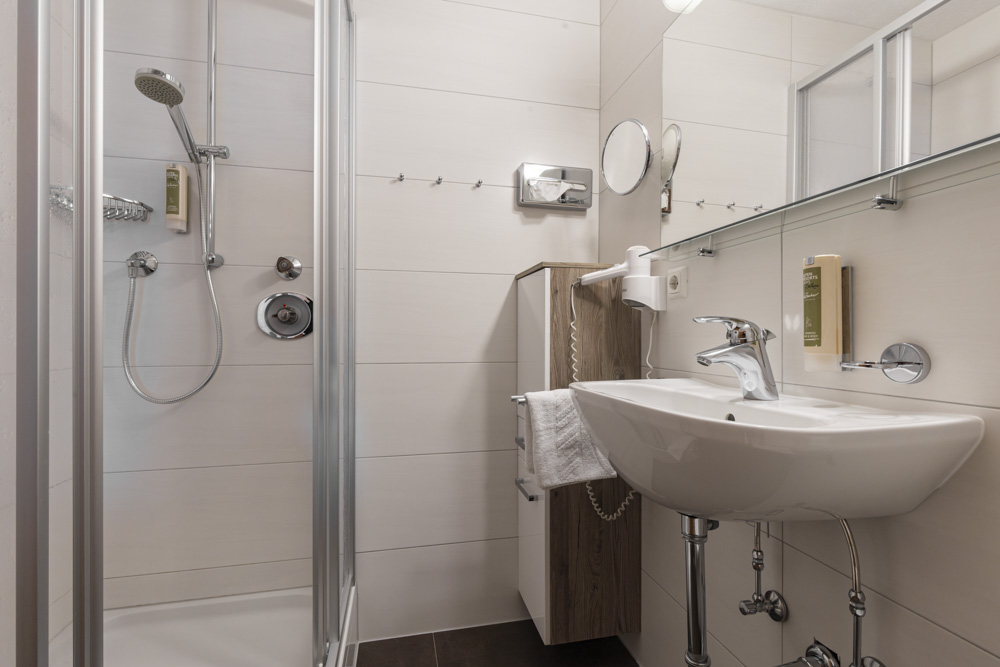 - zwei Badezimmer mit Dusche, WC, Kosmetikspiegel und Föhn