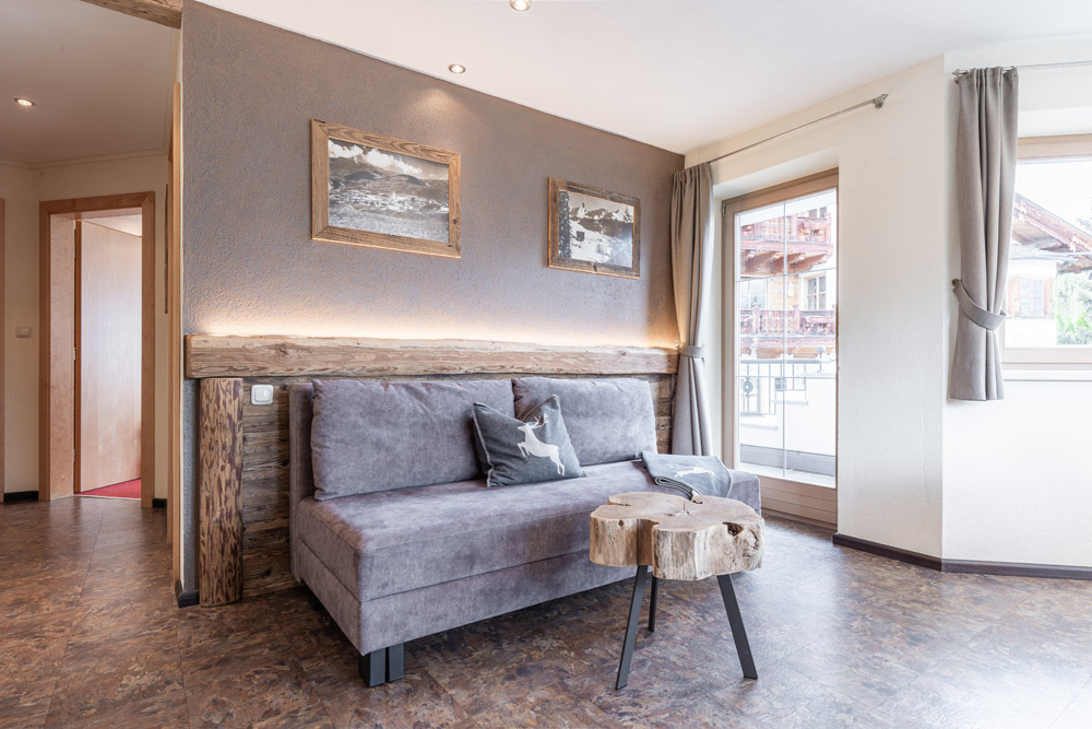Gemütliche Küchenzeile mit holzgetäfelten Schränken und malerischen Kunstwerken. Im Apartment 5 für 4-5 Personen in Ladis bietet ein kleiner Essbereich Holzstühle und einen Tisch. Ein elegantes Sofa unter einem Bilderrahmen verstärkt die einladende Atmosphäre.