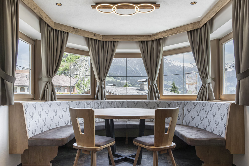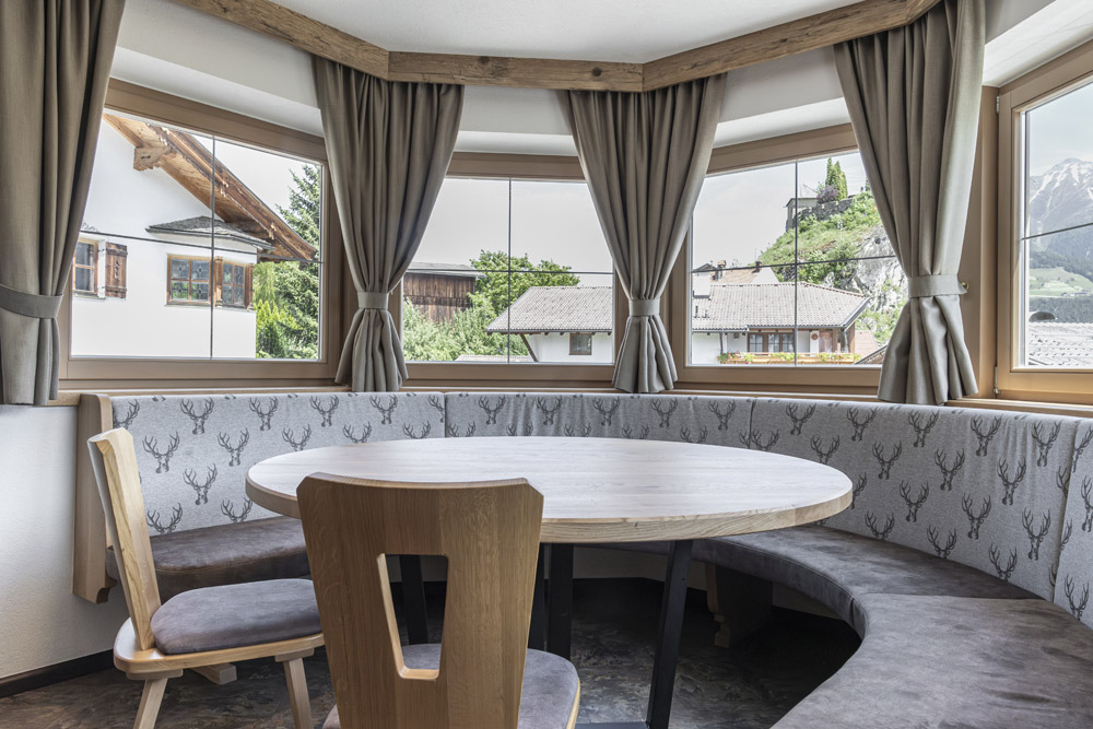 Das Apartment Erker hat einen spektakulären Blick auf die Burg Laudegg zu bieten. Das Erkerzimmer mit einem großen Esstisch ist der ideale Ort für ein gemeinsames Frühstück bei herrlichem Panoramablick.