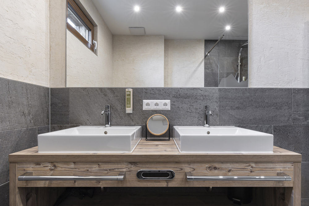 - zwei Badezimmer mit Kosmetikspiegel und Föhn, eines mit Dusche, eines mit Dusche und WC