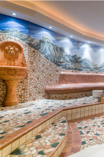 Gezeigt wird ein hölzerner Saunainnenraum mit Bänken, Teil des Wellnessbereichs im Laudegghof. Die Tür ist geöffnet und gibt den Blick auf einen mit Mosaikfliesen ausgelegten Raum frei, an dessen Außenseite sich ein Wandgemälde mit einer Berglandschaft befindet. Auf dem Boden stehen ein Holzeimer und eine Schöpfkelle, während warmes Licht eine gemütliche Atmosphäre schafft.